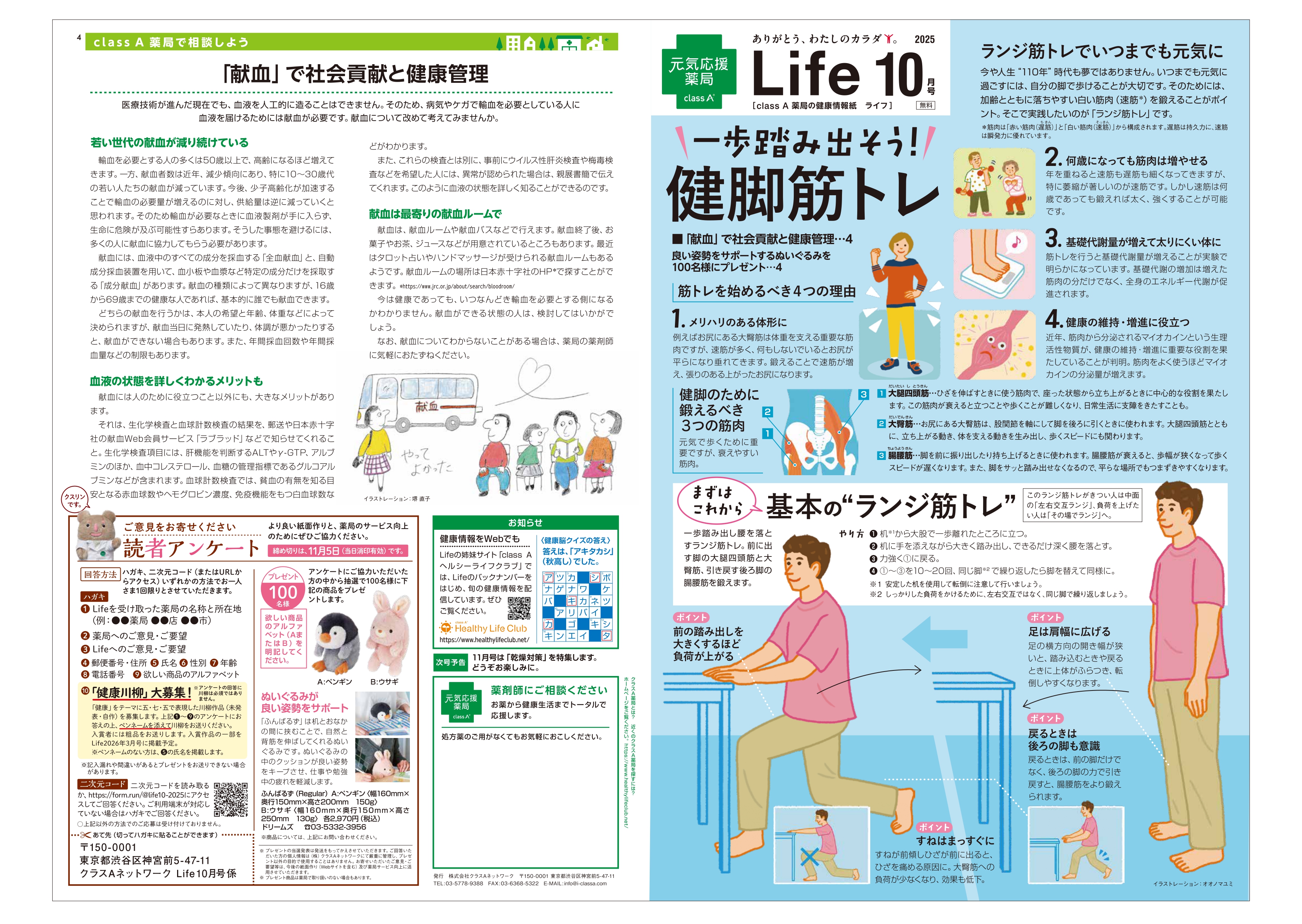 さて、10月のLifeは「一歩踏み出そう 健脚筋トレ」のタイトルです。年齢とともに落ちやすい白い筋肉(速筋)を鍛えるランジ筋トレについて特集しています。また、献血と健康管理についても紹介しています。参考にしてみてください。