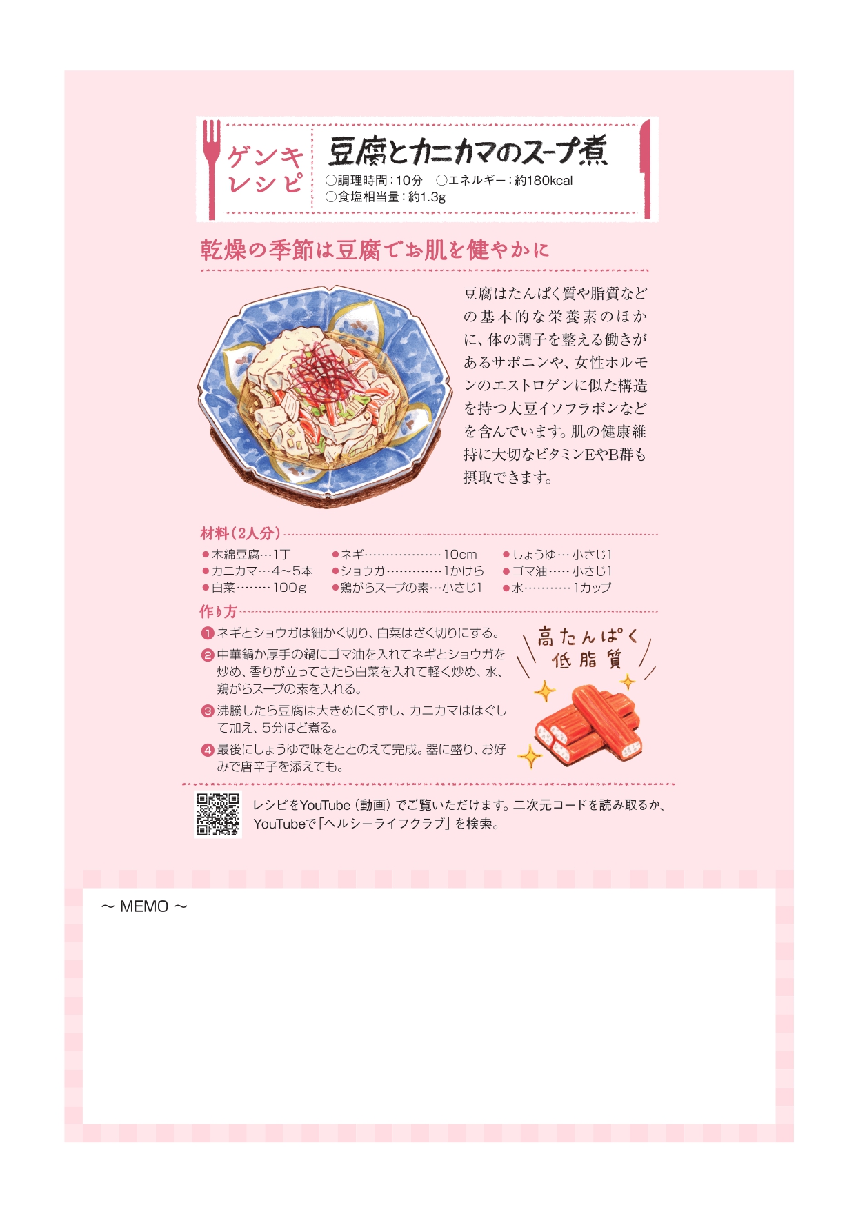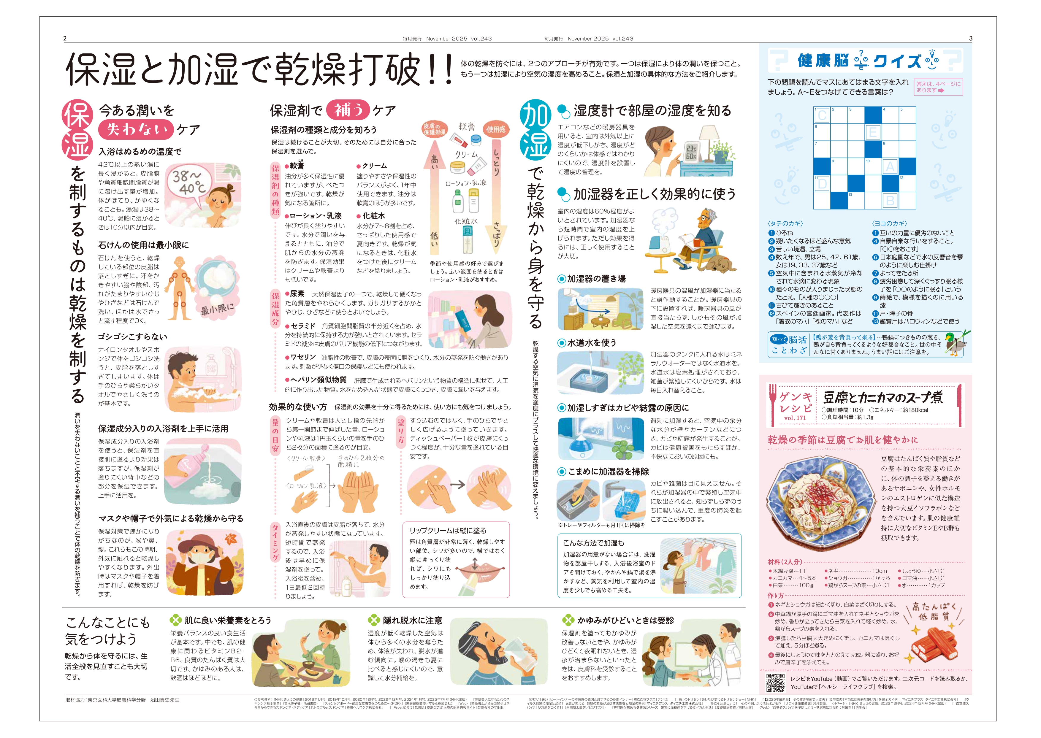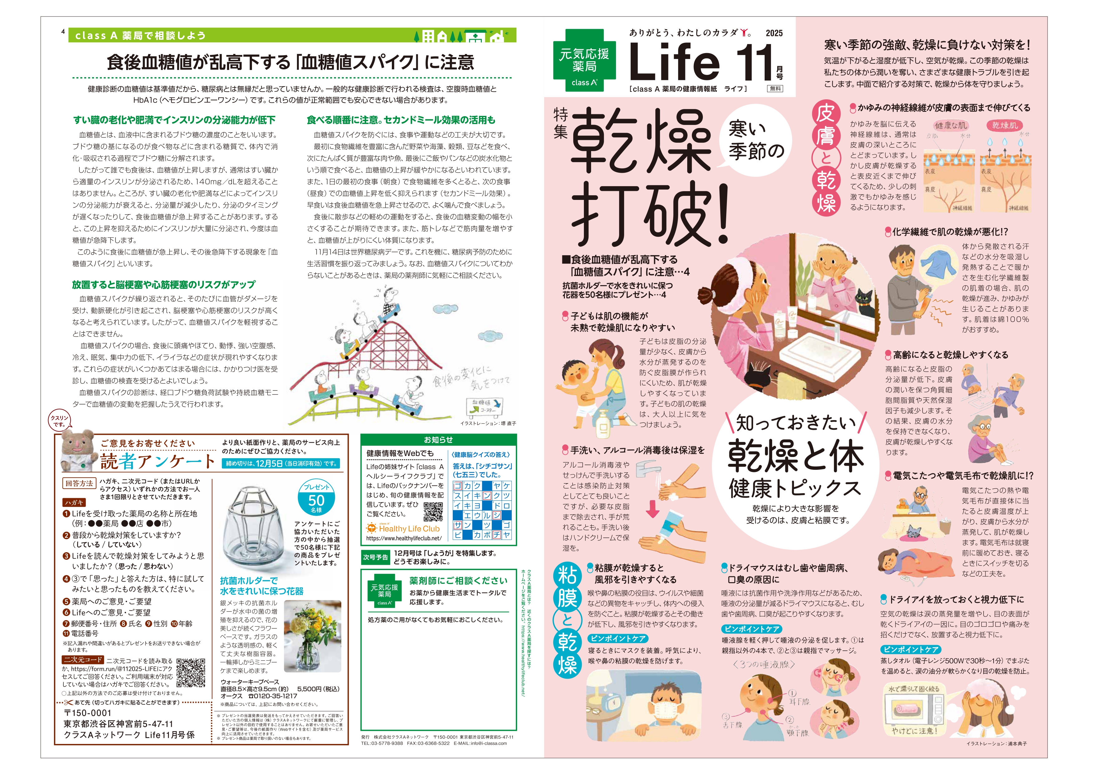 さて、11月のLifeは「冬の乾燥打破 乾燥と体健康トピックス」のタイトルです。乾燥によって引き起こされる、過体のかゆみ、ドライマウスなど病気の原因にもなる症状について書かれています。また、食後の血糖値が乱高下する「血糖値スパイク」が引き起こす健康被害についても書かれています。参考にしてみてください。